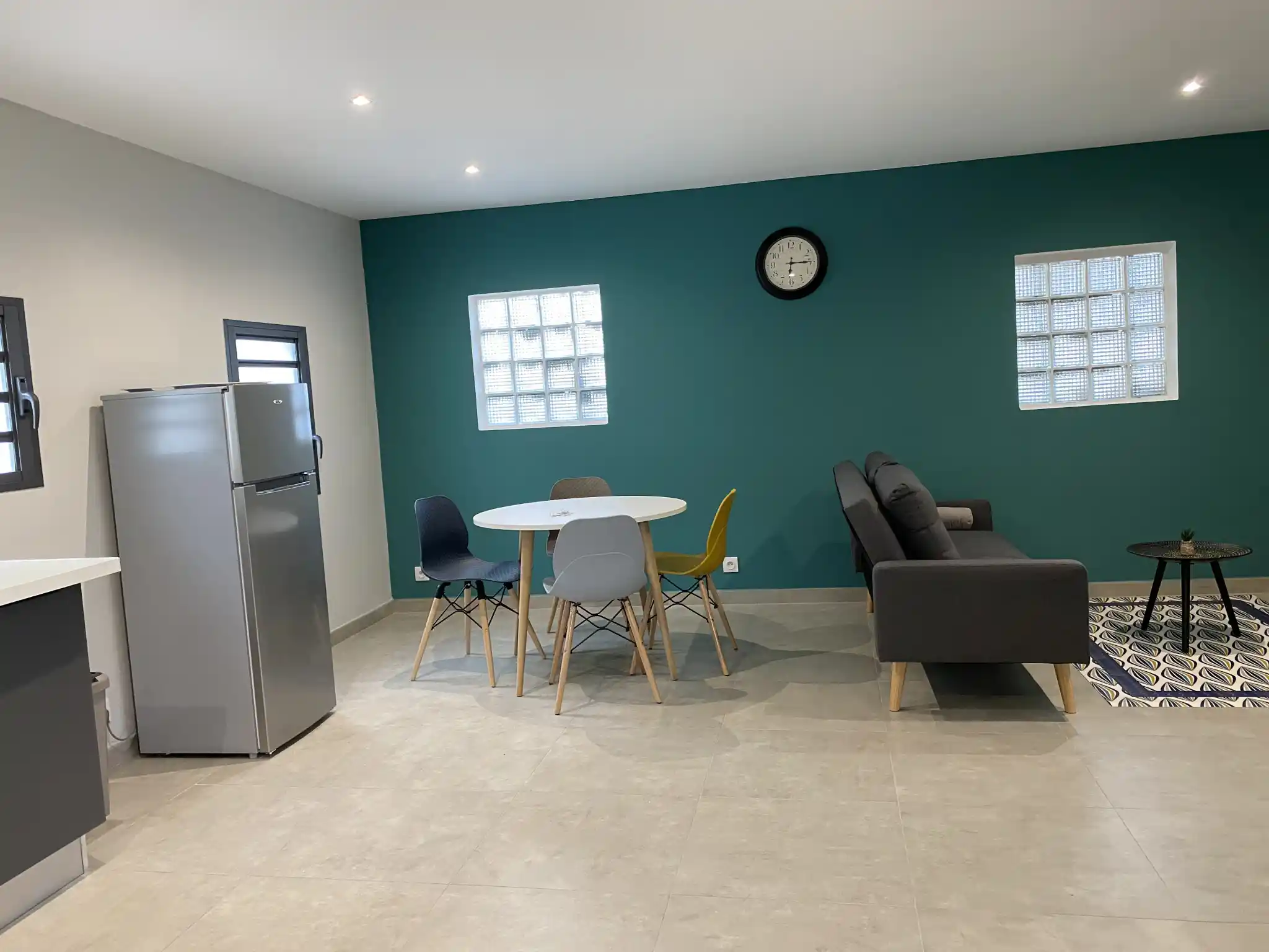 Un spacieux séjour lumineux avec espace salle à manger et salon convivial