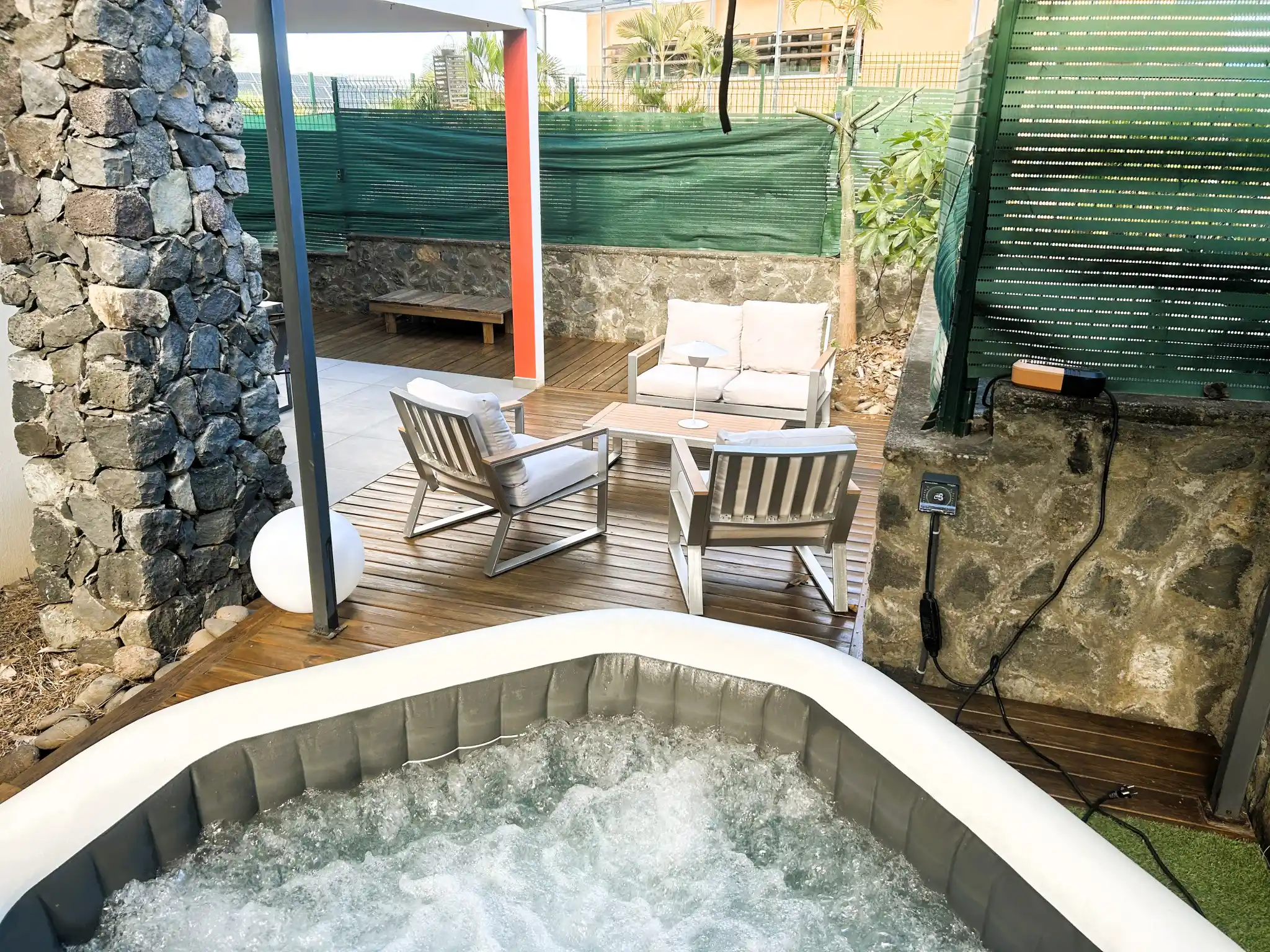 LNA propose en primeur à Saint-Paul, dans une résidence de standing sécurisée, ce très bel appartement de 2 chambres, varangue, terrasse et jardin proposant quasi 180m2 utiles à ses occupants : à l'intérieur de 64m2 bien agencé, le jardin privatif, le séchoir, mais surtout la varangue et la terrasse aménagée avec son jacuzzi vous apportent un grand confort de vie. Le séjour-cuisine moderne, restauré récemment et bien meublé et équipé offre 32m2, la salle d'eau et l'espace nuit comprenant 2 chambres climatisées avec placard et 2 lits doubles en très bon état.