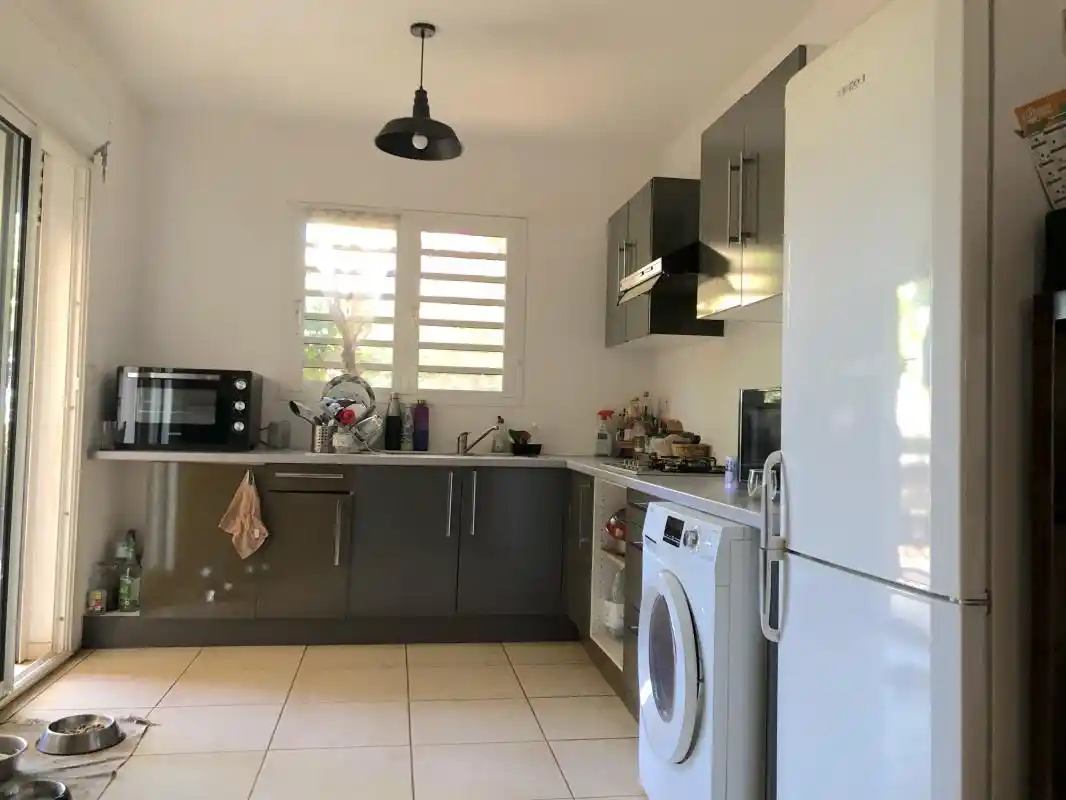 La maison est composée : d'un abri voiture de 20,46 m2, une cuisine aménagée ouverte sur le séjour, 3 chambres climatisées avec rangements, une salle d'eau avec wc, et salle de bains avec wc