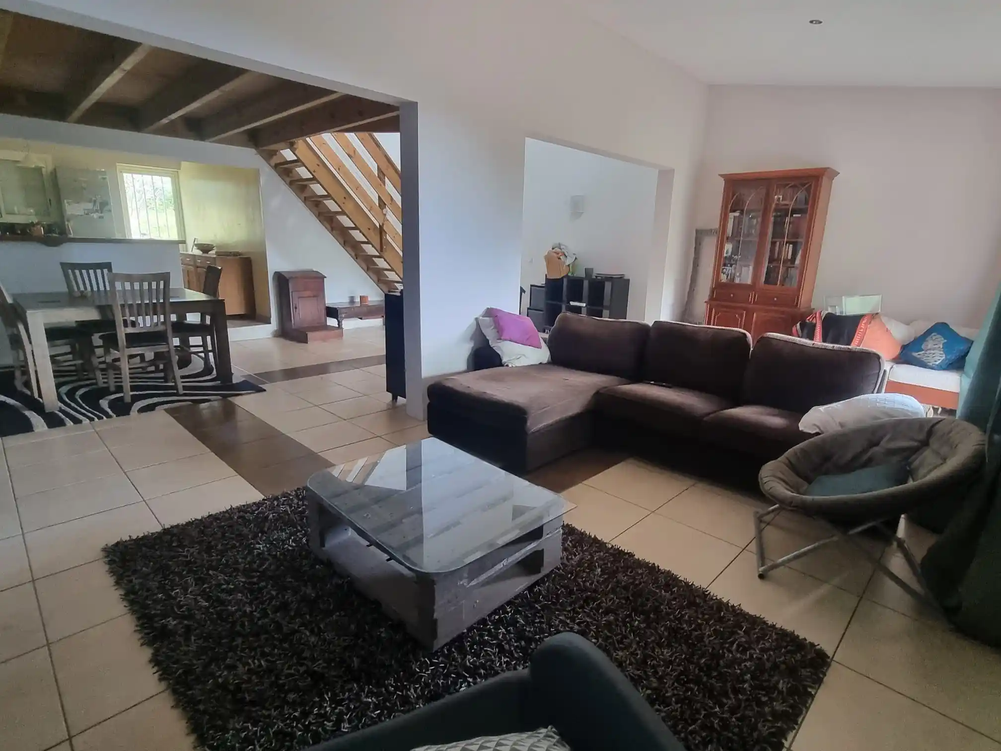 Séjour lumineux avec poutres apparentes et grandes baies vitrées