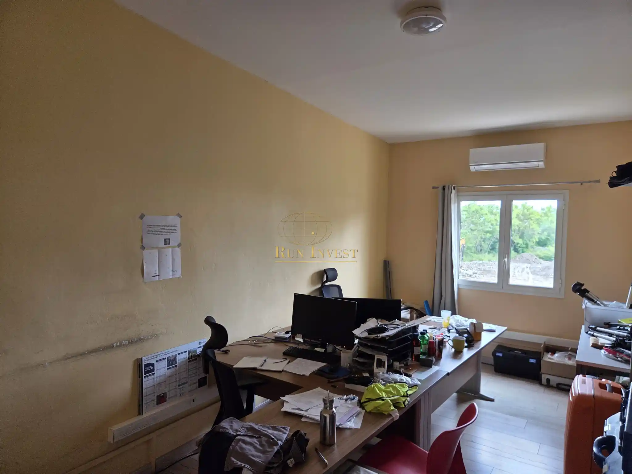 Les aménagements actuelles permettent une zone de stockage ou de bureaux de 40m2 - un accueil - un bureau de direction au RDC - A l'étage 3 grand bureaux, une cuisine, une terrasse.