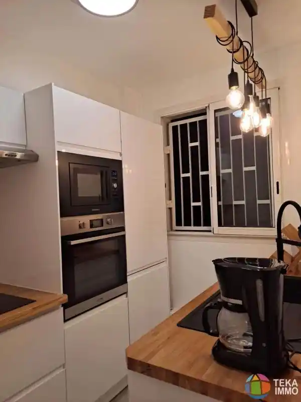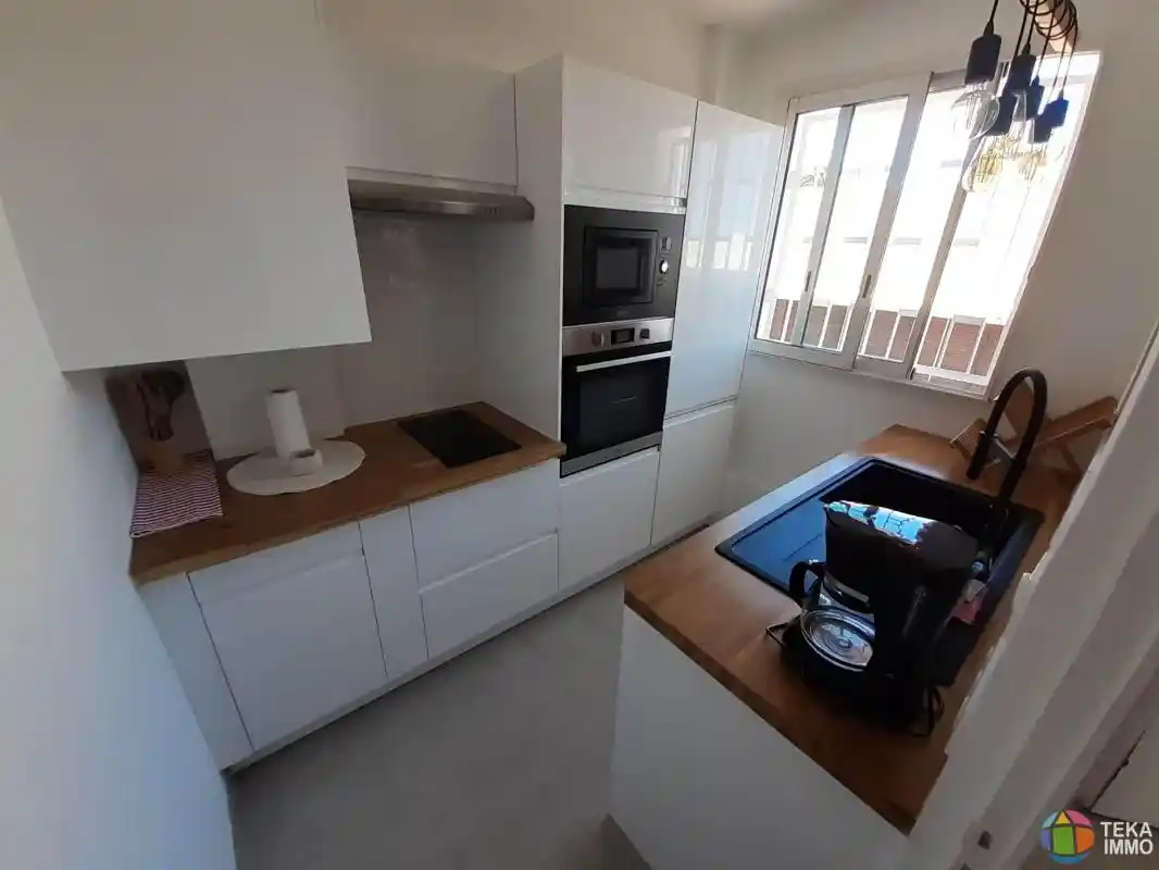 L'appartement à été totalement rénové et remis à neuf avec goût. Il est composé d'une cuisine aménagée et équipée, un séjour, deux chambres climatisées dont une avec placard. La salle de bain dispose d'une jolie douche à l'italienne, wc indépendant.