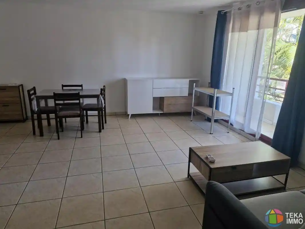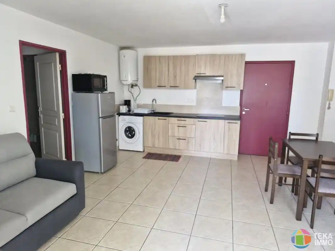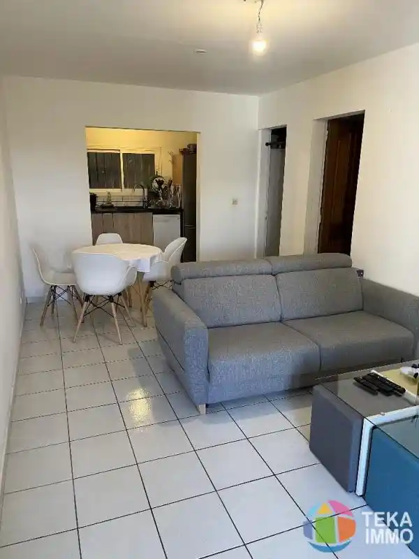 une entrée, un séjour avec brasseur d'air, une cuisine américaine équipée, un dégagement desservant une salle d'eau, un wc séparé, une chambre avec placard et brasseur d'air, chauffe eau solaire, un parking sous sol.