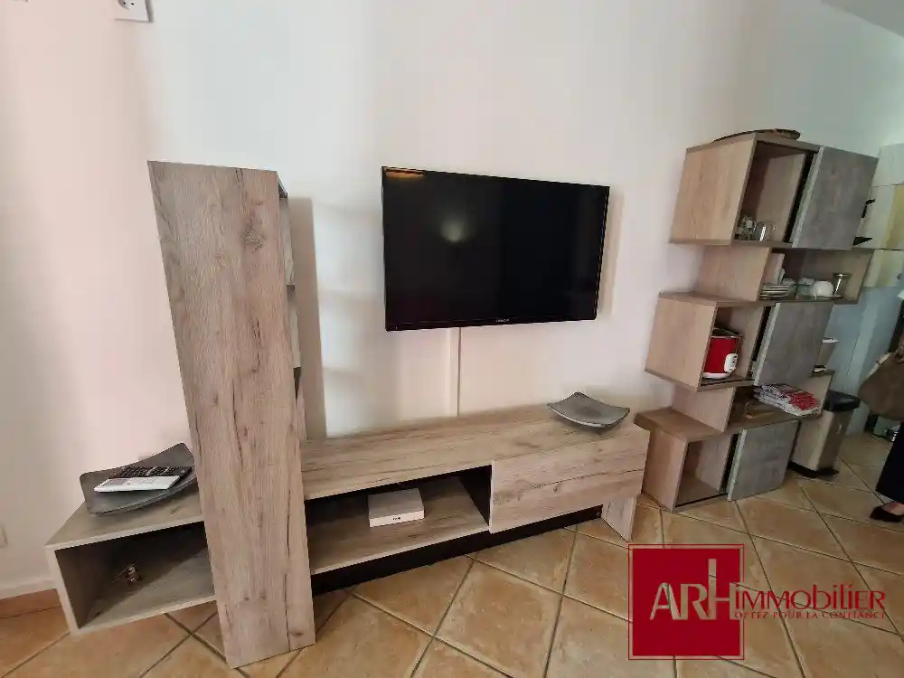 T1 MEUBLE LOCATION LONGUE DUREE EN RESIDENCE PRINCIPALE, climatisé, d'une surface de 25 m² avec varangue, comprenant une entrée avec kitchenette, une pièce de vie ouverte sur varangue avec belle vue sur la piscine, une salle d'eau avec wc, une cave privative, une place de parking aérienne.