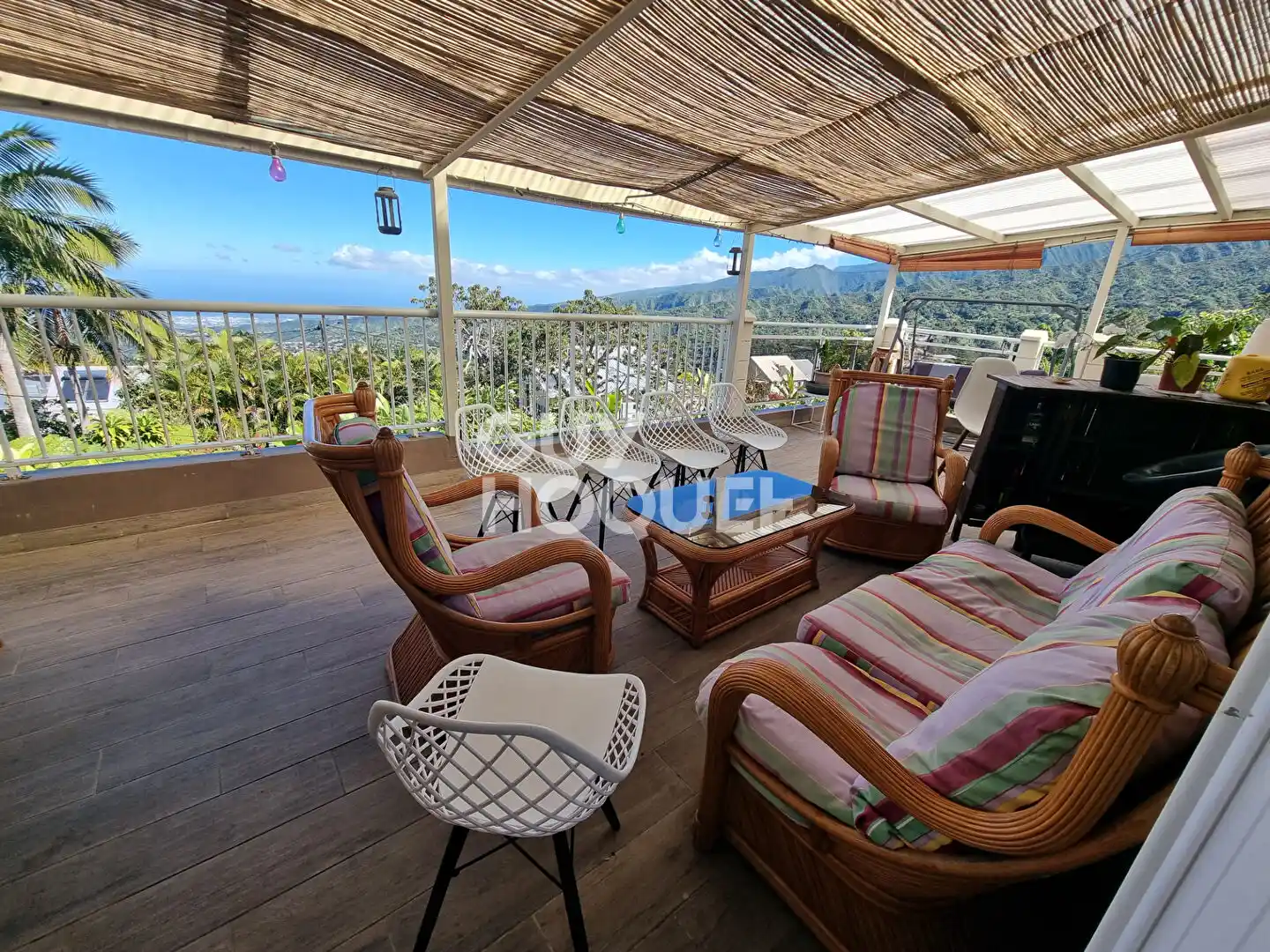Au niveau R+1 : une varangue de 42 m² avec vue mer et montagne, une cuisine ouverte sur le salon salle à manger, une chambre, une salle d'eau, un wc et un débarras ainsi qu'une dépendance de type studio.