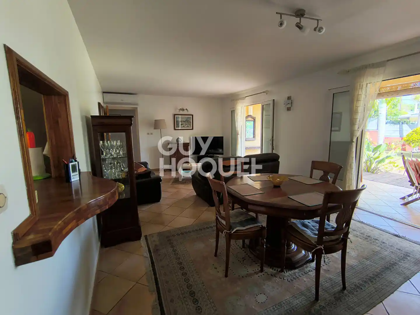 Elle se compose d'une cuisine équipée et aménagée (plaque 4 feux , frigo congélateur, hotte, lave-vaisselle, meubles bas et hauts), un salon-salle à manger climatisé donnant sur une grande terrasse, dégagement, wc, salle d'eau, 3 chambres dont 2 avec placards et une climatisée avec armoire, un garage fermé, une varangue.