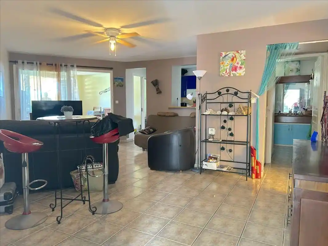 Un séjour agréable ouvrant sur sa varangue d'environ 14 m2, une cuisine aménagée, deux chambres climatisées avec placards, une salle d'eau, un WC séparé