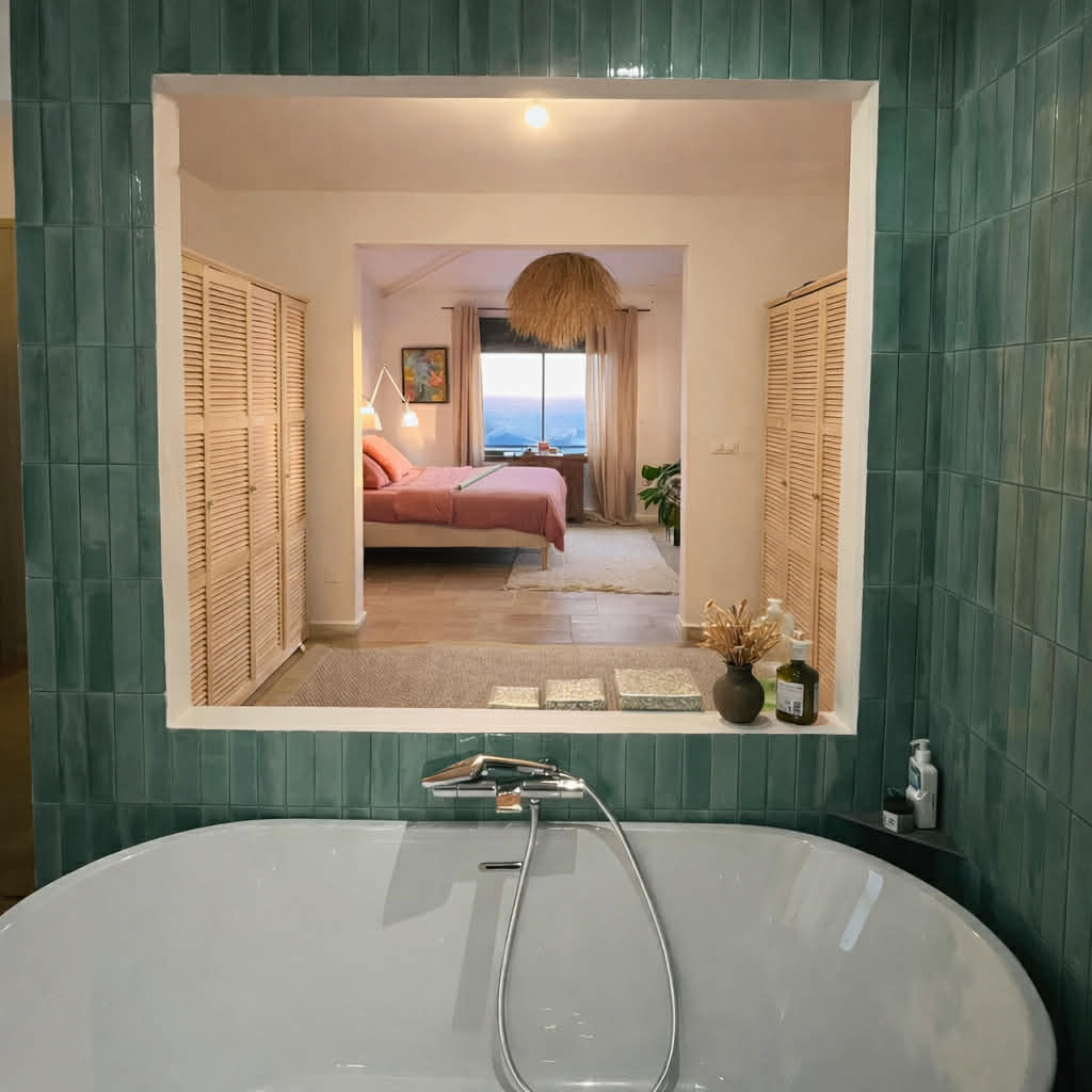 La maison dispose de 3 chambres climatisées, chacune bénéficiant de sa salle de bain privative et de son dressing, avec vue mer depuis chaque chambre.