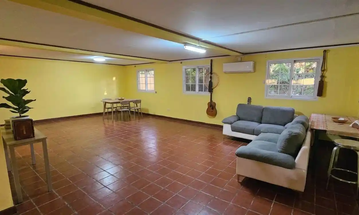 Au rez-de-chaussée : - un grand espace de vie facilement, modulable (chambre No3) - une cuisine de 15 m2 - une salle de bain - un WC séparé - un atelier - une petite cuisine secondaire