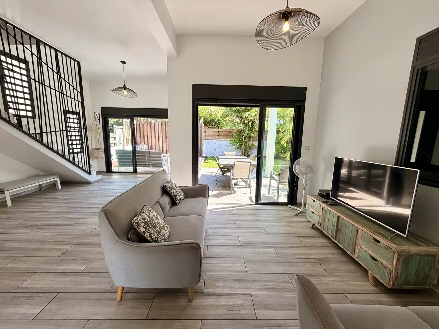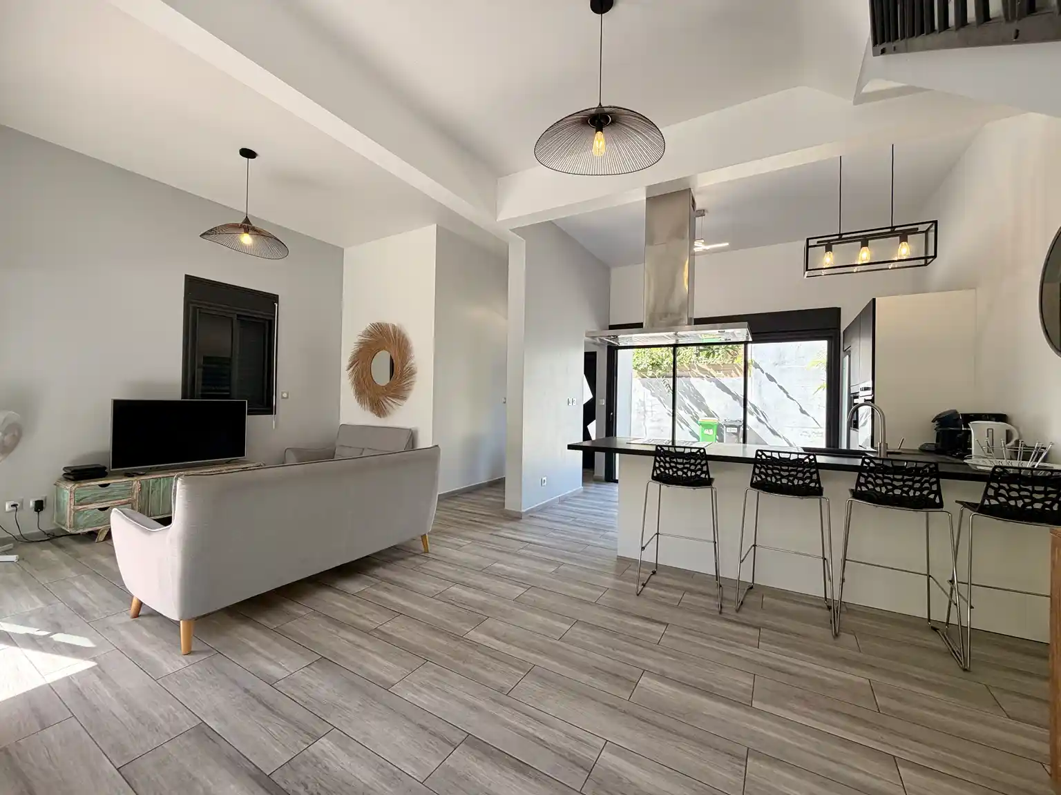 - au rez-de-chaussée : d'une entrée, cuisine américaine entièrement équipée ouverte sur un lumineux séjour donnant sur ma terrasse/piscine. Une salle d'eau avec douche l'italienne et meuble double vasque.