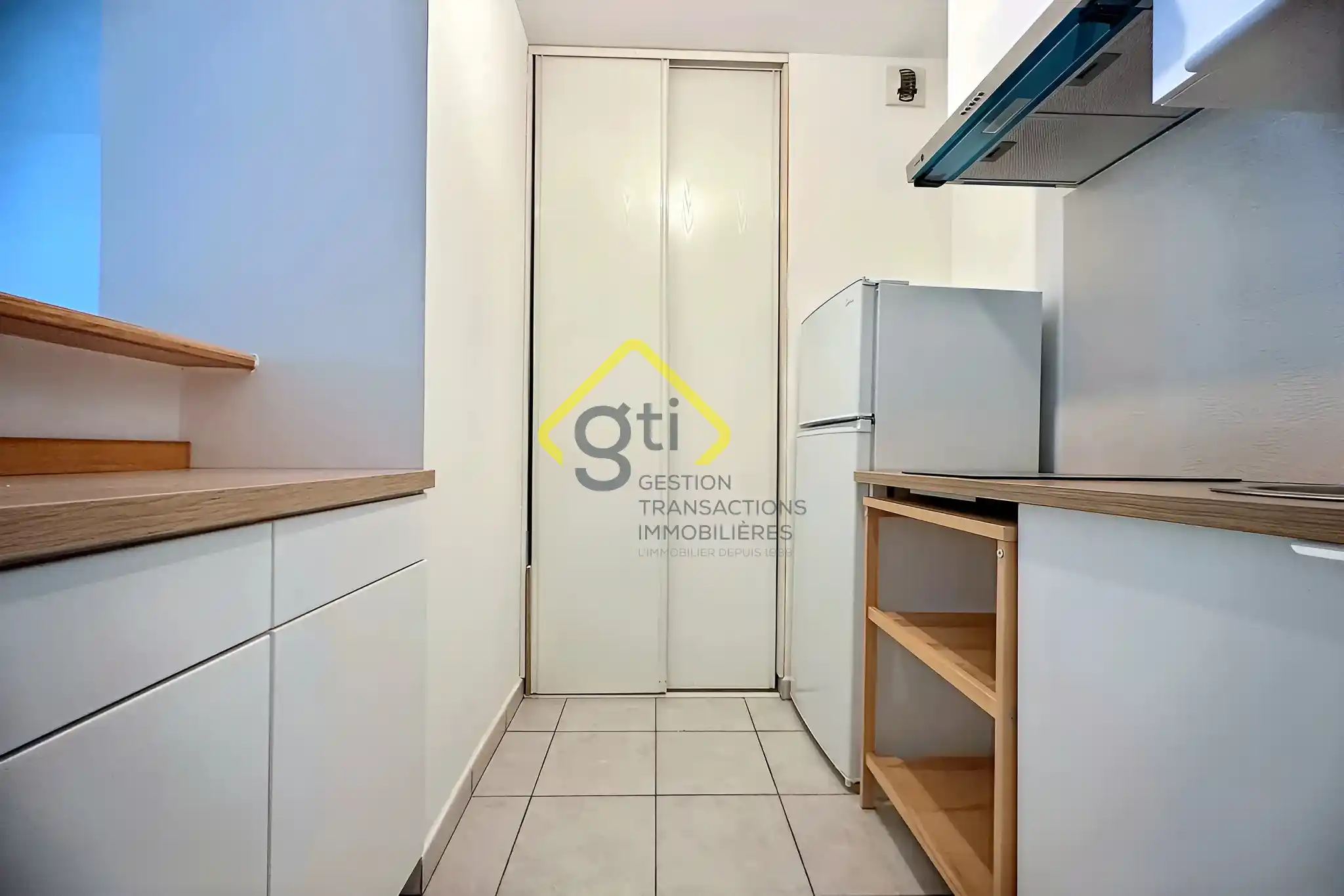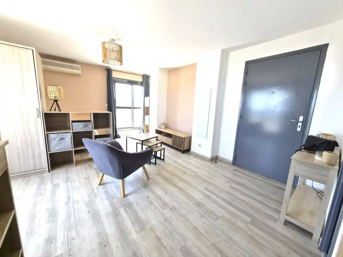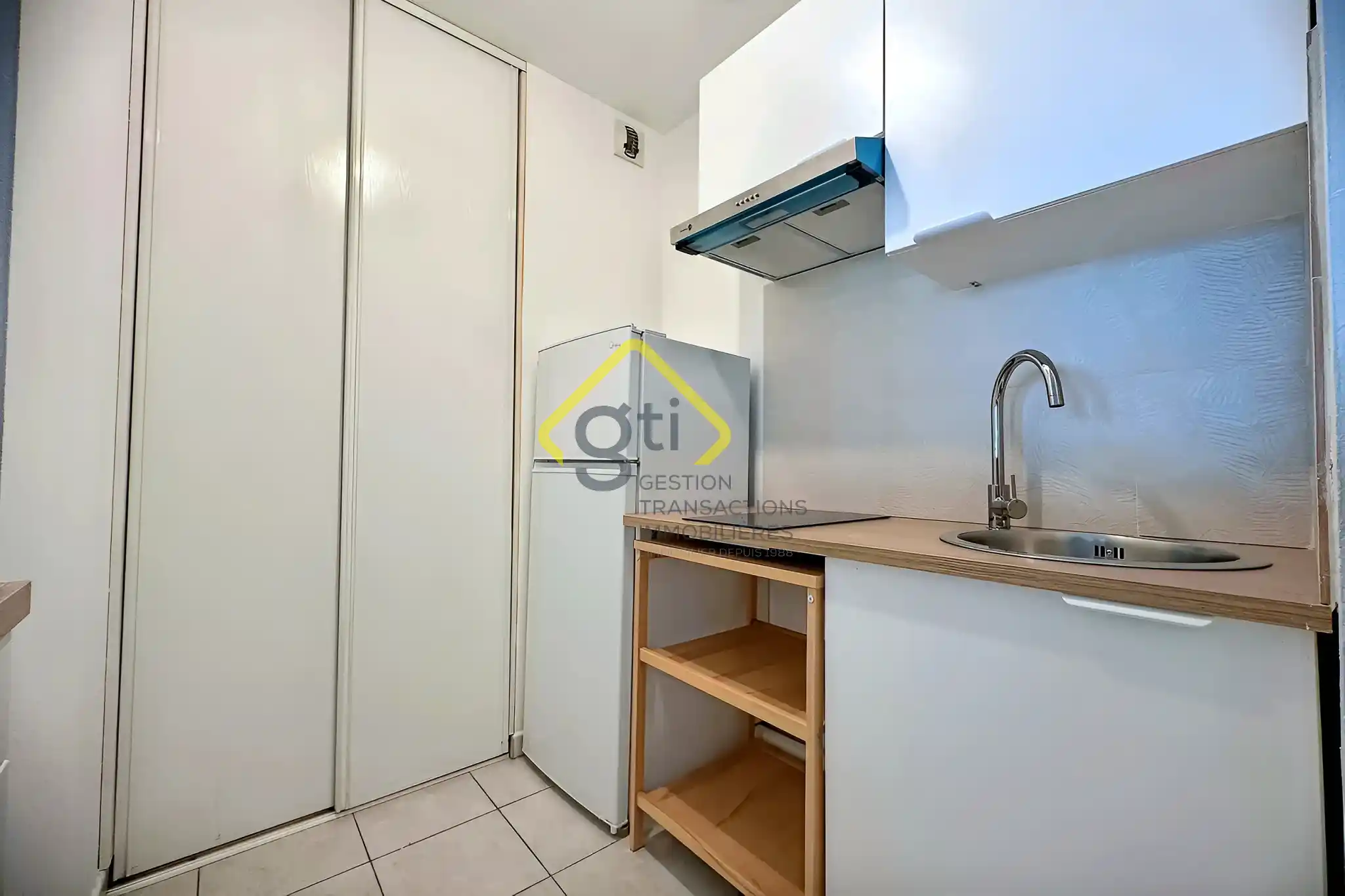 La pièce de vie dispose d'un placard, et s'ouvre sur une cuisine neuve, équipée de plaques de cuisson, d'un réfrigérateur et d'une hotte. La salle de bain, entièrement refaite à neuf, comprend une cabine de douche, un lavabo et des WC.