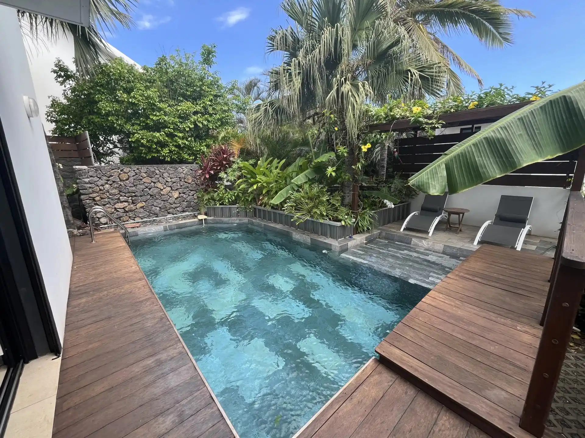 Cette propriété spacieuse séduit par son agencement soigné et sa luminosité, avec de grandes baies vitrées coulissantes en aluminium donnant accès à des petites cours pour chaque chambre et à une piscine élégante entourée de végétation tropicale.
