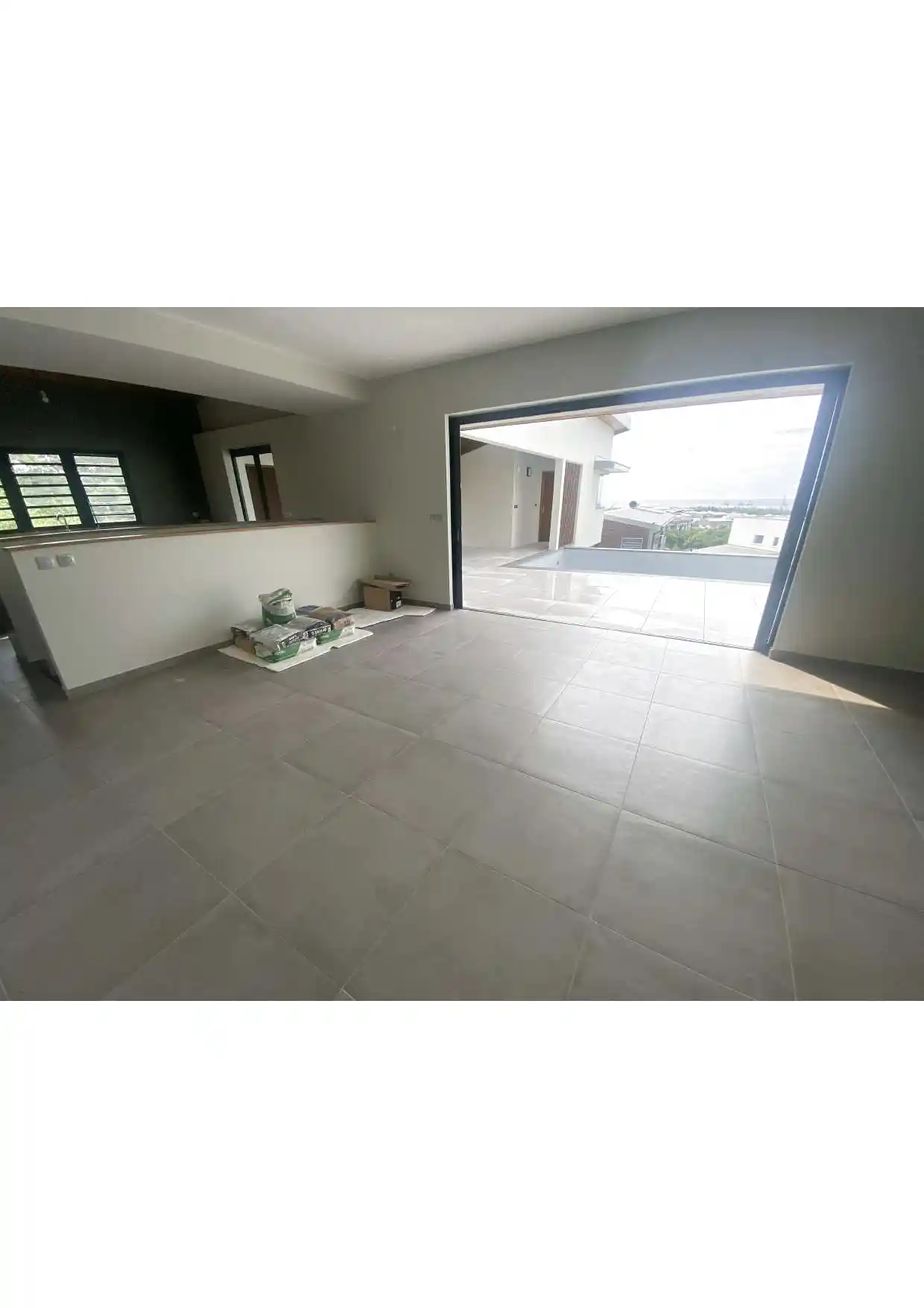 Un séjour lumineux donnant accès à une terrasse avec piscine