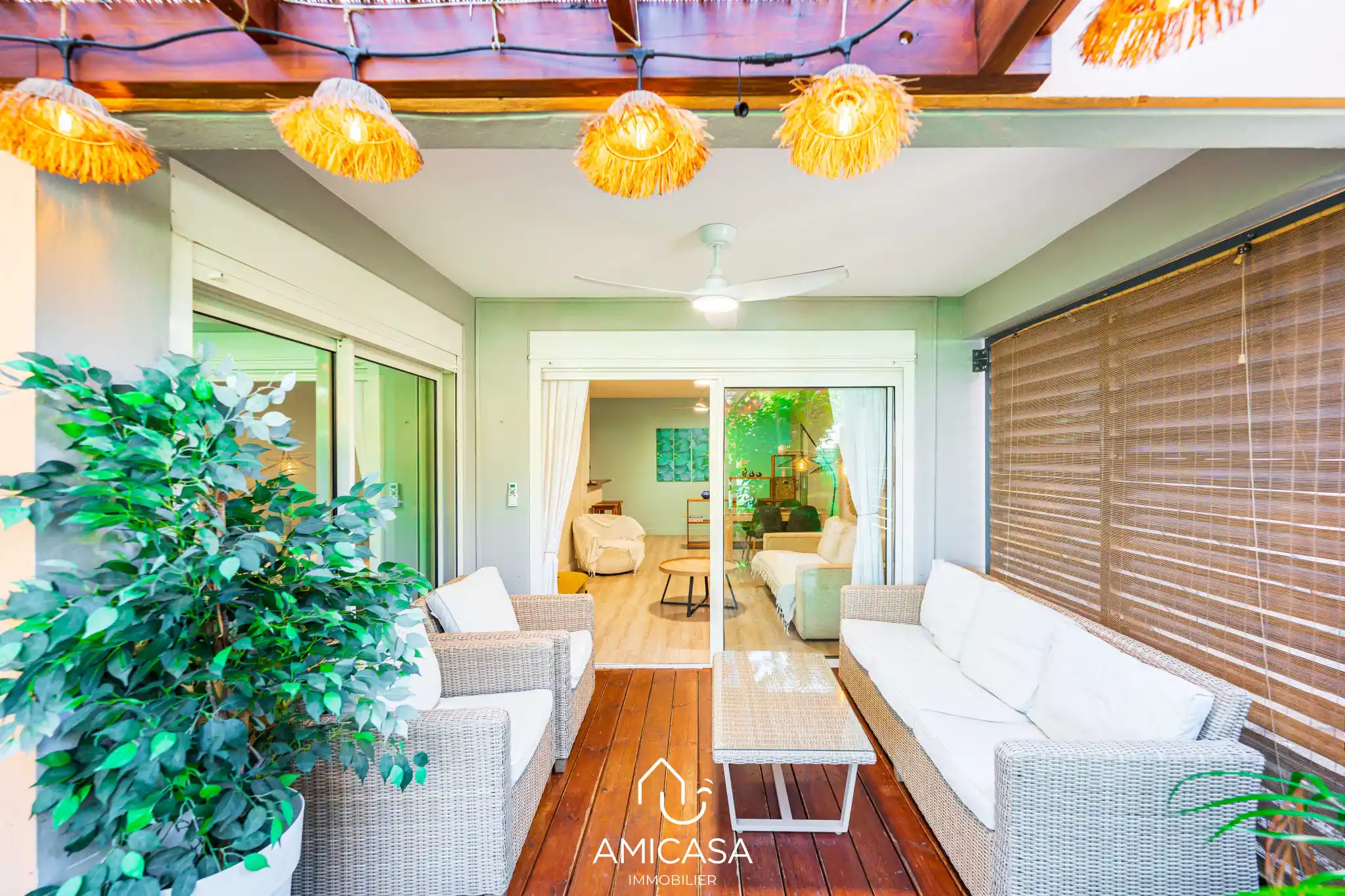 À l'extérieur, vous profitez d'une agréable varangue prolongée par un jardin privatif de 25 m2, idéal pour vos moments de détente en plein air.
