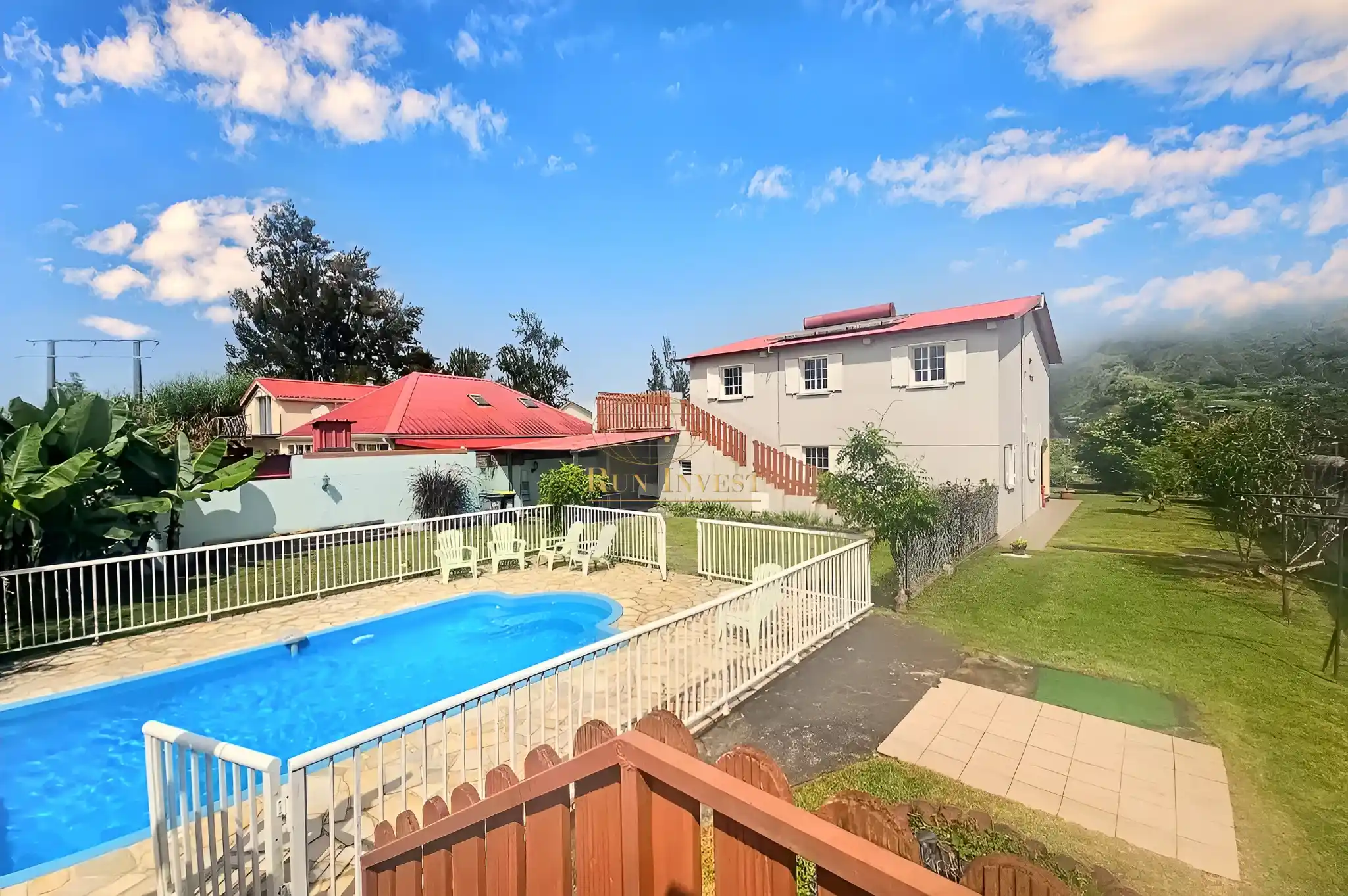À l'extérieur : Le jardin, de type créole, est entièrement végétalisé et arboré, offrant un cadre agréable et authentique. Vous profiterez également d'une piscine et d'un abri de jardin, avec une vue dégagée sur le Piton des Neiges.